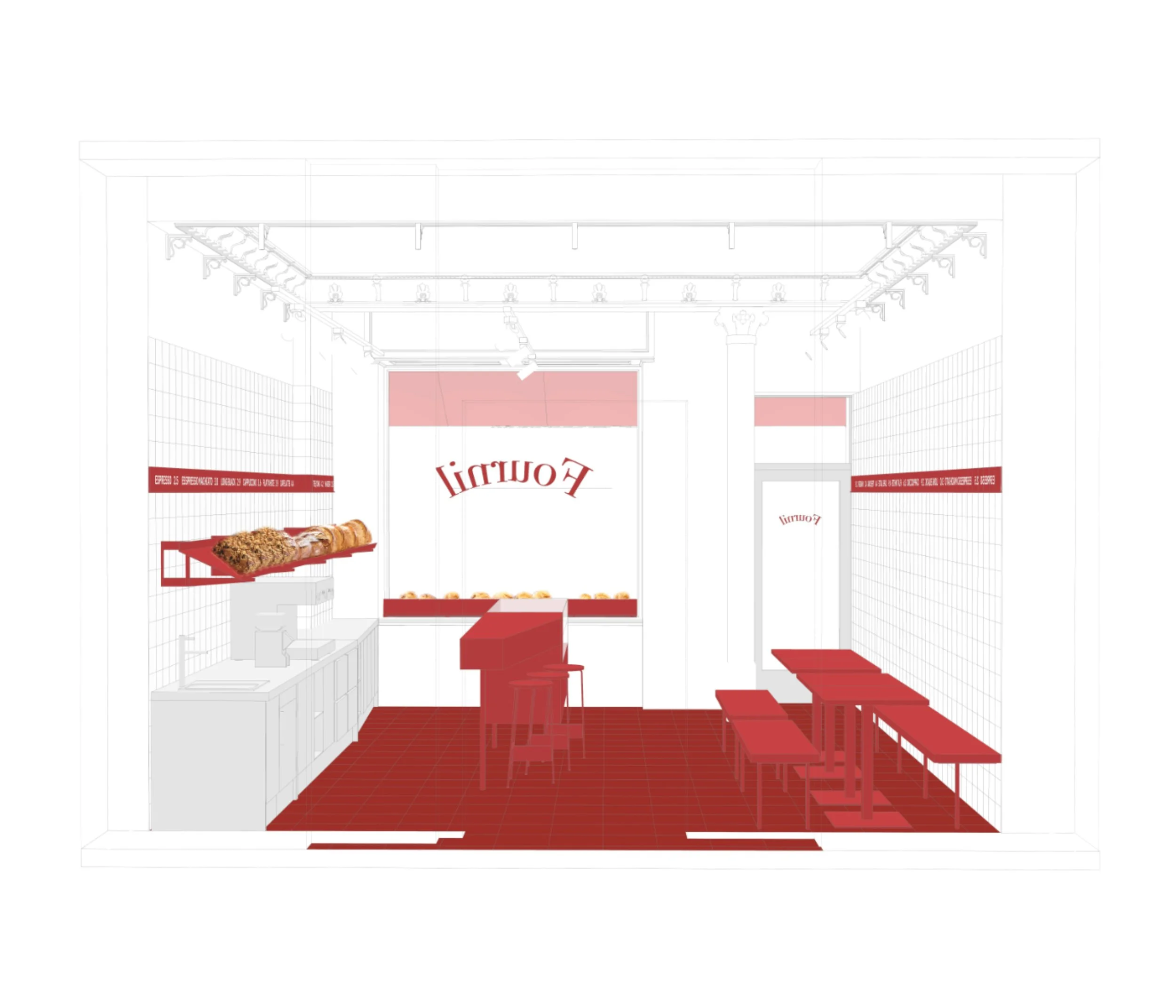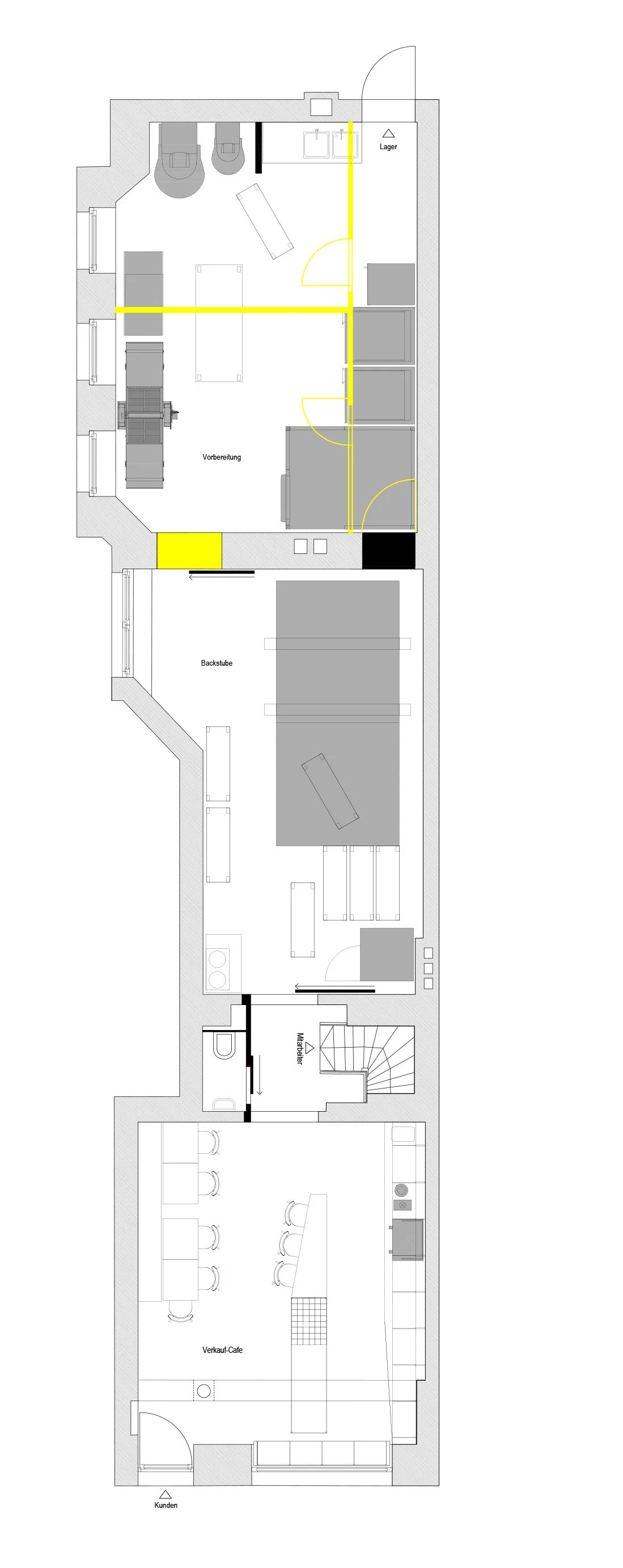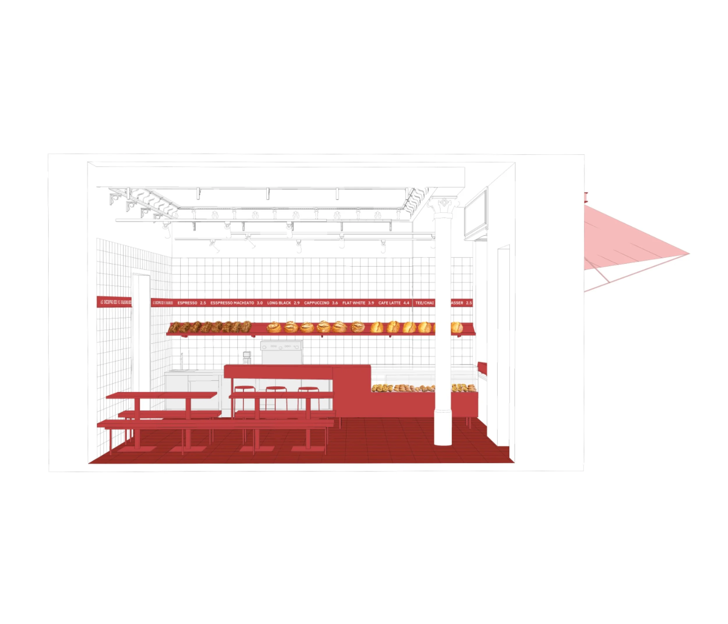 A 100m² retail space was to be converted into a Bakery and Café. The task comprised a production area with cooling chambers and furnaces, and a salesroom and cafe.
